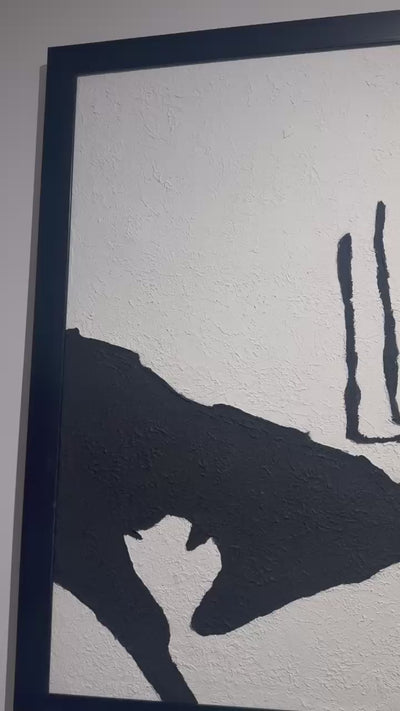This minimalist oil painting explores tension and harmony through bold black forms set against a textured white surface. The mirrored silhouettes suggest balance, reflection, and the fragile connection between opposing forces, inviting quiet contemplation and interpretation.