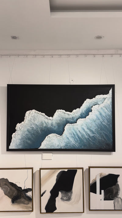 “Edge of Silence” captures the quiet tension between creation and void — where icy textures seem to dissolve into infinite darkness. The sculpted white and blue ridges resemble glacial formations or oceanic waves frozen in time, symbolizing fragility, resilience, and transformation. The stark contrast between the textured surface and the black abyss evokes the moment before stillness breaks — a visual meditation on the beauty of isolation and the depth of silence.