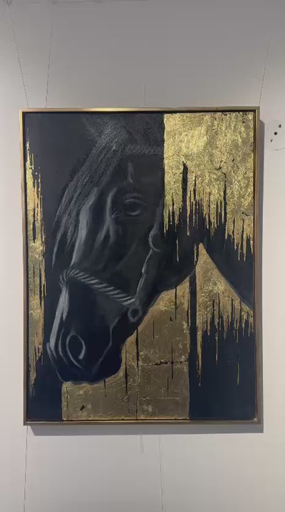 This striking acrylic painting presents a powerful horse emerging from deep shadows, accented by cascading gold textures. The contrast between matte darkness and luminous gold evokes strength, dignity, and restrained emotion, capturing a moment of quiet intensity and noble stillness.